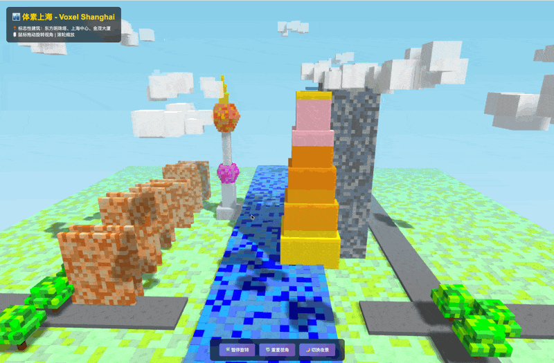 设计并创建一个非常有创意、精心且细致的体素(voxel)艺术场景:主题是上海白天的建筑风景。让整个场景看起来震撼、多样化,并使用色彩丰富的体素。使用