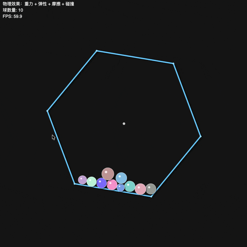 使用 p5.js(无需 HTML)创建 10 个彩色球在旋转六边形内弹跳的效果,考虑重力,弹性,摩擦和碰撞。